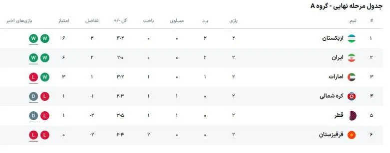 تیم ملی ایران با کسب دومین پیروزی خود در این مرحله همراه با ازبکستان تبدیل به تنها تیمهای ۶ امتیازی این گروه شدند.