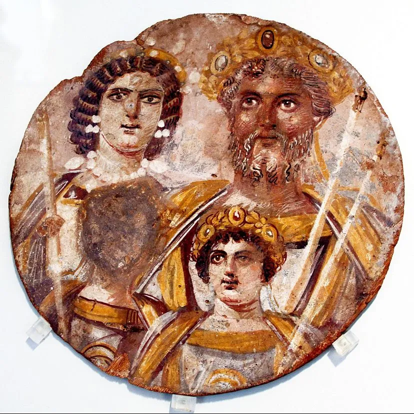 تصویری از خاندان چهار نفری سوران، حاکمان امپراطوری روم. تصویر یکی از آنها، «گتا»، به دلیل فرمان محو یادبودی که برادرش بر ضدش اجرا کرد پاک شده است