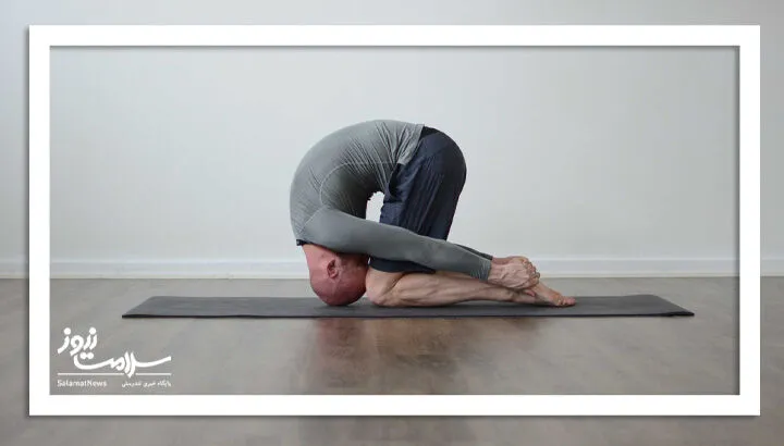 بازدم کنید و به جلو خم شوید تا پیشانیتان روی مت قرار گیرد.