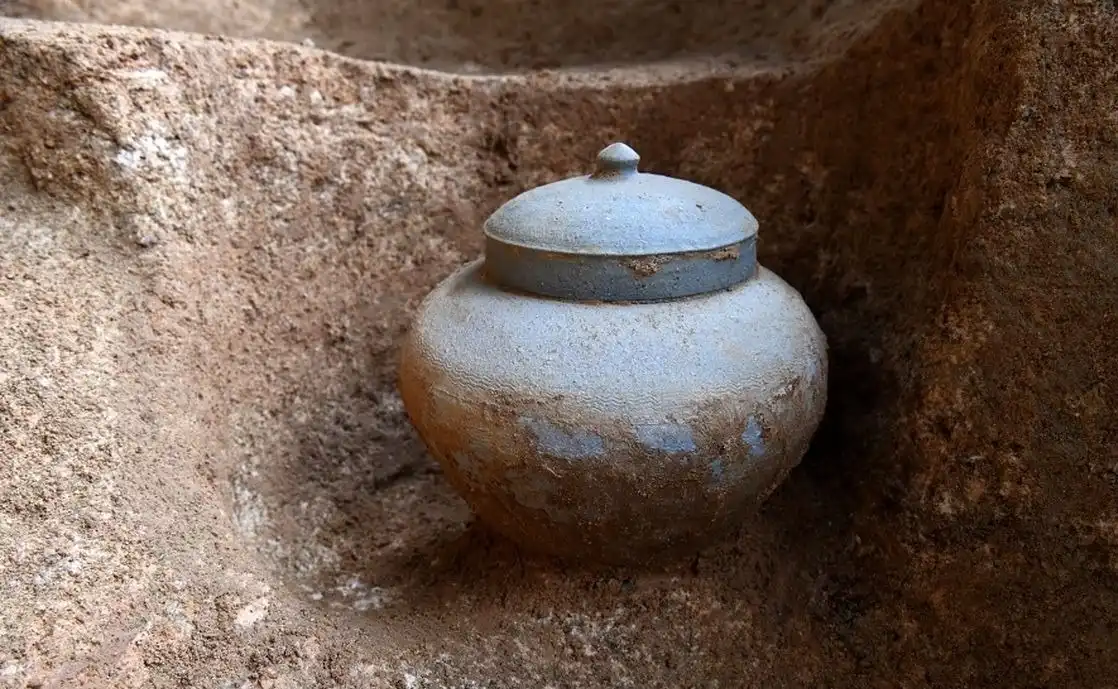 در گوشهای از این بنا کوزهای نیز کشف شده که بهعنوان جیجینگو شناخته میشود؛ ظرفی آیینی که پیش از آغاز ساختوساز در زمین دفن میشده تا از روح زمین طلب امنیت و آرامش شود. این کوزه گردن کوتاهی دارد و روی درپوش آن دستهای مهرهایشکل دیده میشود. در درون این کوزه پنج سکه چینی از نوع «وو جو» یافت شده که نوعی نذری برای انجام بیخطر ساختوساز بوده است.