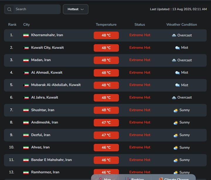 هشت شهر استان خوزستان در ایران، روز ۲۲ مرداد ۱۴۰۴ (۱۳ آگوست ۲۰۲۵)، با ثبت دمای بین ۴۶ تا ۴۸ درجه سانتیگراد، در میان ۱۲ شهر اول گرمترین نقاط جهان قرار گرفتند.