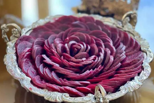اگر دوست دارید اسم یا پیامی خاص روی سفره یلدا نمایش دهید، میتوانید لبو را به شکل حروف یا عدد برش بزنید. این روش برای تزیین سفرههای یلدای شخصیسازی شده ایدهآل است.
