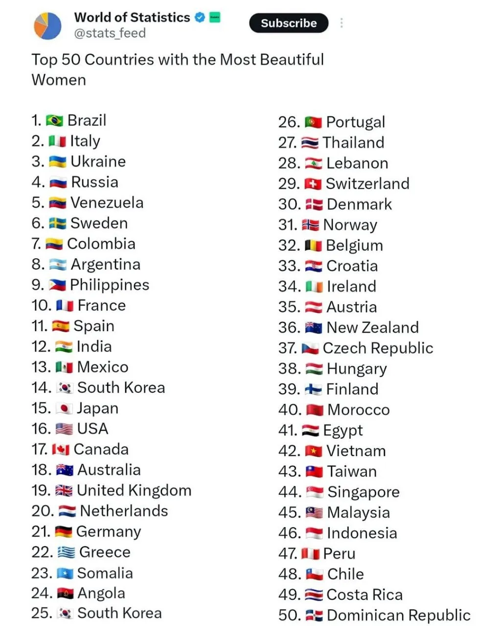 فهرستی با عنوان ۵۰ کشور که زیباترین زنان را دارند در شبکههای اجتماعی مطرح شده و توجه بسیاری از کاربران را به خود جلب کرده است. این ردهبندی که کشورهایی از آمریکای لاتین، اروپا، آسیا و آفریقا را دربر میگیرد، با واکنشهای گستردهای همراه بوده و بحثهای فراوانی درباره معیارها و اعتبار آن شکل گرفته است.