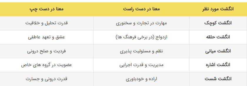جدول معانی انگشتر بر اساس دست چپ و راست