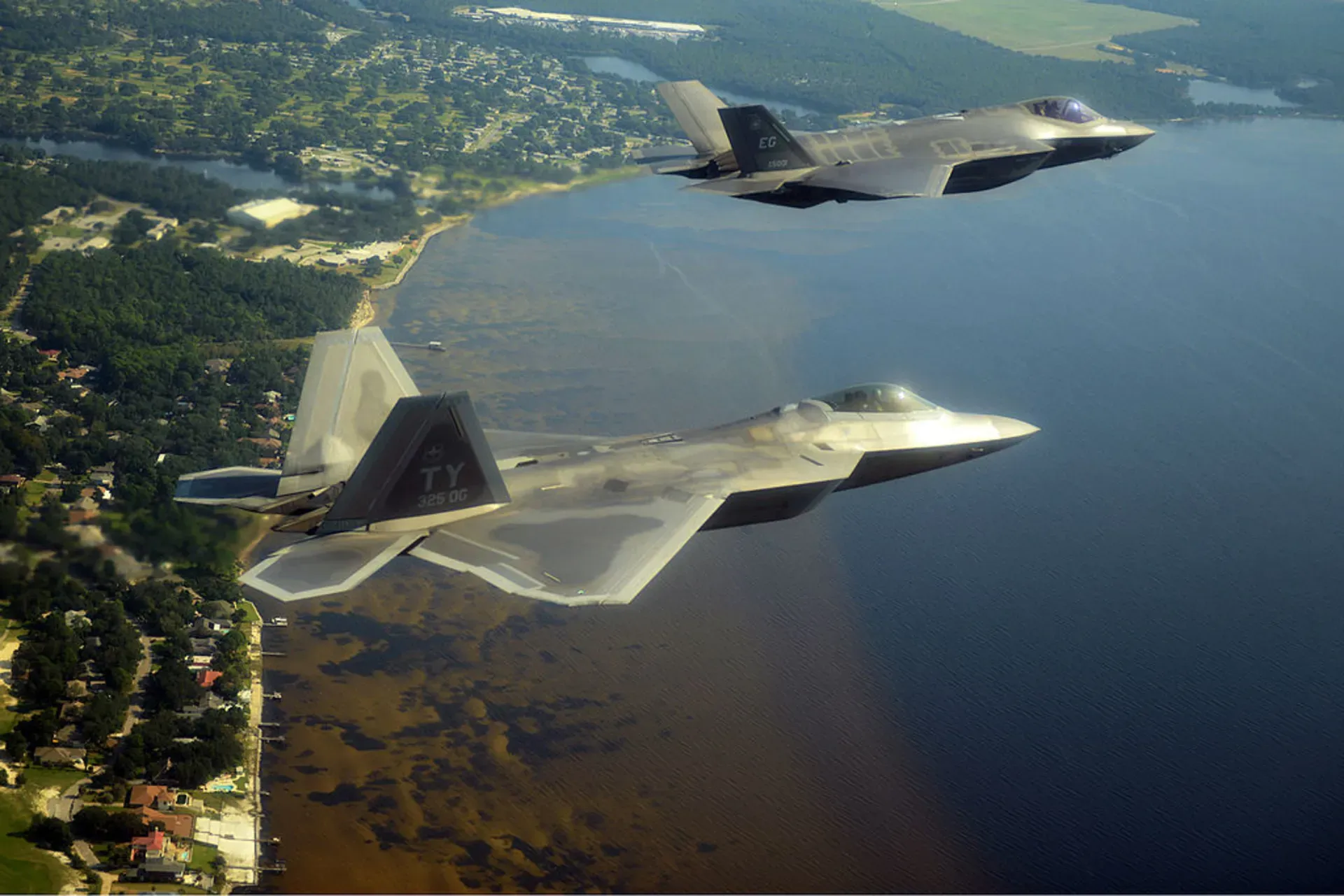 تصویری از بالا دو جنگنده پیشرفته اف-۲۲ و اف-۳۵ را نشان می دهد که تفاوت اندازه آن ها جلب نظر می کند.
