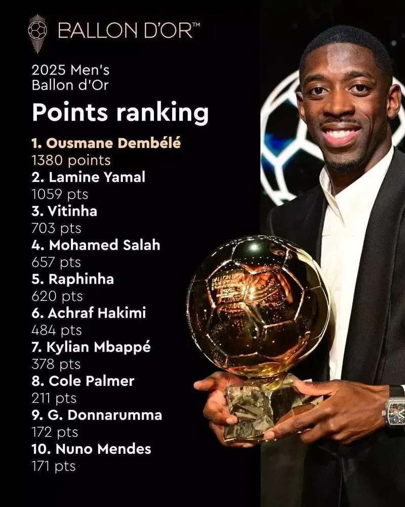 نشریه فرانس فوتبال به عنوان برگزار کننده مراسم اهدای توپ طلا، جزئیات مربوط به امتیازات نامزدهای دریافت مهمترین جایزه انفرادی دنیای فوتبال در سال 2025 را منتشر کرد. توپ طلای امسال، دوشنبه هفته پیش به عثمان دمبله، ستاره فرانسوی پاریسنژرمن رسید که فصل گذشته به این تیم برای درو کردن همه جامها کمک کرده بود. پس از او لامین یامال، ستاره 18 ساله بارسلونا دوم شد، در حالی که خیلیها بر این باور بوده و پیشبینی کرده بودند که او توپ طلا را میبرد.