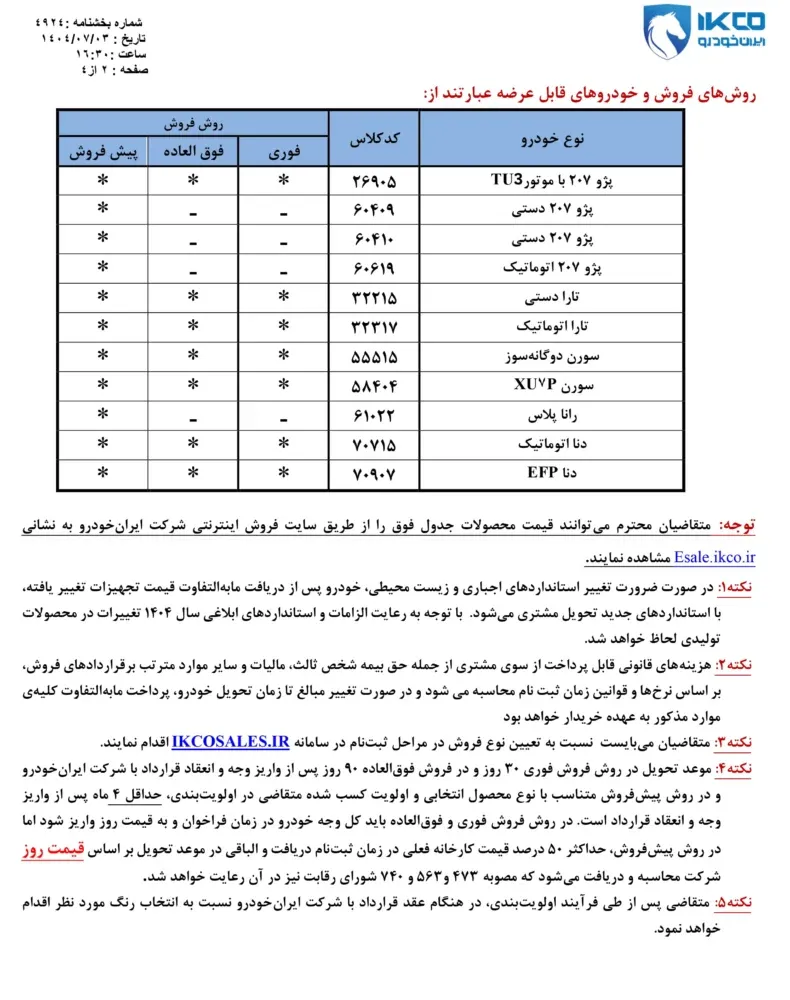 شرایط فروش پژو ۲۰۷، تارا، دنا پلاس، سورن پلاس، رانا پلاس از سوی ایران‌خودرو ویژه مهر ماه اعلام شد
